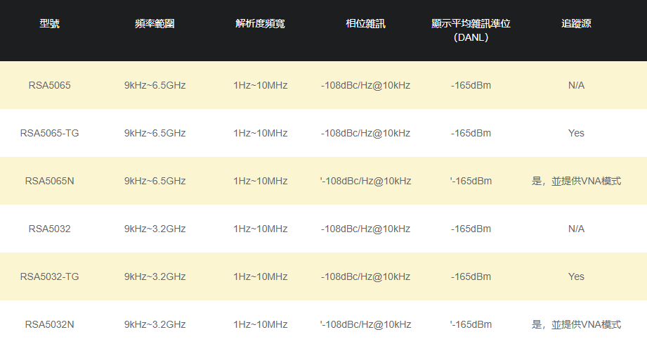RSA5000即時頻譜分析儀,配備實時分析及掃頻分析功能,可選向量信號分析應用軟件(VSA)及EMI測量應用軟件(EMI),擁有優異的性能及指標。其頻率範圍9kHz至3.2GHz/6.5GHz,並提供帶有跟蹤源“-TG”型號,可廣泛的應用于企業研發、工廠生産、教育教學等諸多領域。