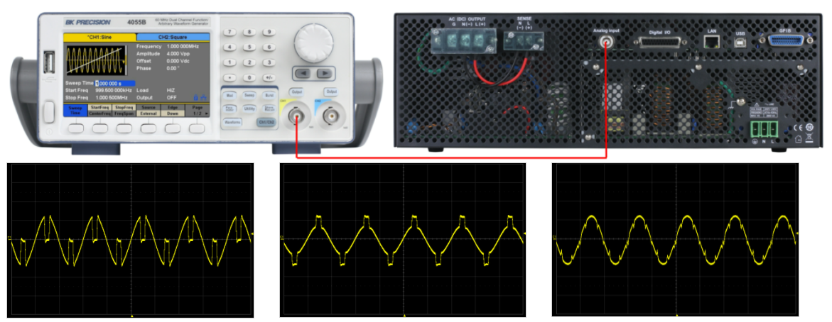 透過Analog Input(BNC)端子可由外部任意波形產生器編輯輸入測試波形,透過9833B/9832B/9831TC內部將波形放大並且輸出,可用來模擬一般無法編輯的波形或是模擬現場觀察到的實際電源波形。所有波型