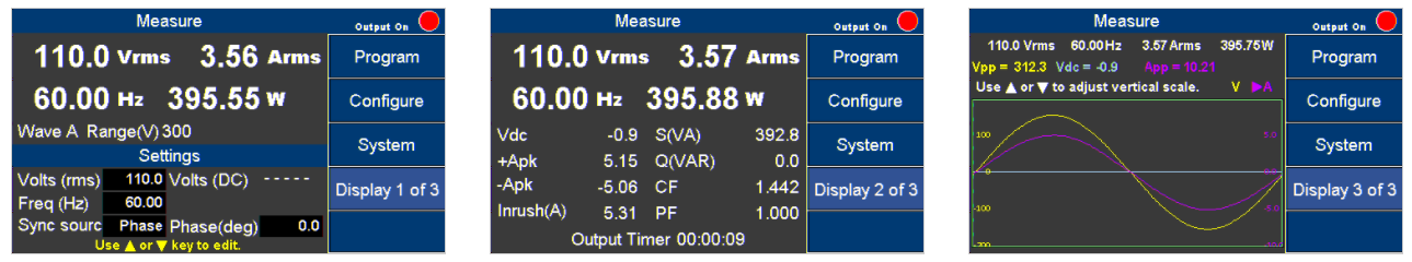 9833B/9832B/9831TC內建16 bit的A/D轉換器量測電路,搭配快速運算的韌體,可提供各種參數的量測,包括Vrms、Arms、Vdc、+Apk、-Apk、App、Vpp、湧浪電流(Inrush Current)、頻率、功率因素(PF)、視在功率(S)、虛功(Q)、實功(P)、波峰因數(CF)等。電壓電流波形量測顯示功能,可在4.3吋彩色LCD可同時顯示電壓電流的輸出波形,讓使用者不需要額外的示波器及電流勾表即可得知目前的吃載電流波形。