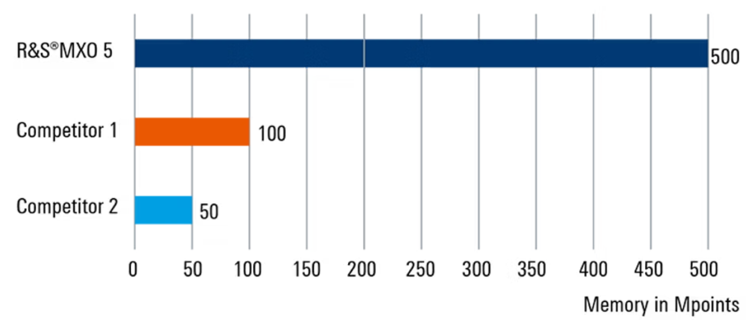 除了頻寬和取樣率之外,記憶體深度在處理各種疑難排解任務時也是最重要的因素之一,更大的記憶體能夠確保示波器在較慢的時間基準設定下,仍能保持最大的取樣率和頻寬;R&S MXO 5C 系列示波器具備標準的 500 Mpoints 同時取樣記憶體,這在同級別的其他示波器中是極為難得的,相當於擁有五倍的標準記憶體深度,這種卓越的記憶體深度確保了工程師能夠在各種應用中進行深入的數據分析和故障排解,而不會因為記憶體不足而受限。