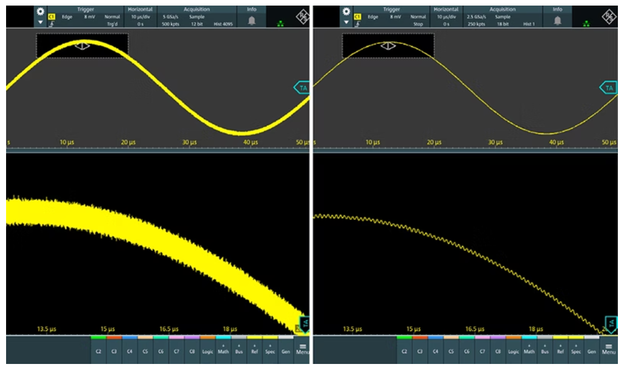 為了增強垂直解析度,通常需要將相鄰取樣進行平均並減少取樣速率,但這可能導致波形問題,例如混疊(aliasing);R&S MXO 5C 硬體中的HD模式使用移動平均濾波器,以消除混疊,然後將 HD 樣本輸送到觸發系統,這樣可以提供高解析度和低雜訊,進行精確的觸發,您可以在保持垂直解析度的同時,避免混疊等波形問題,使測量更為可靠。