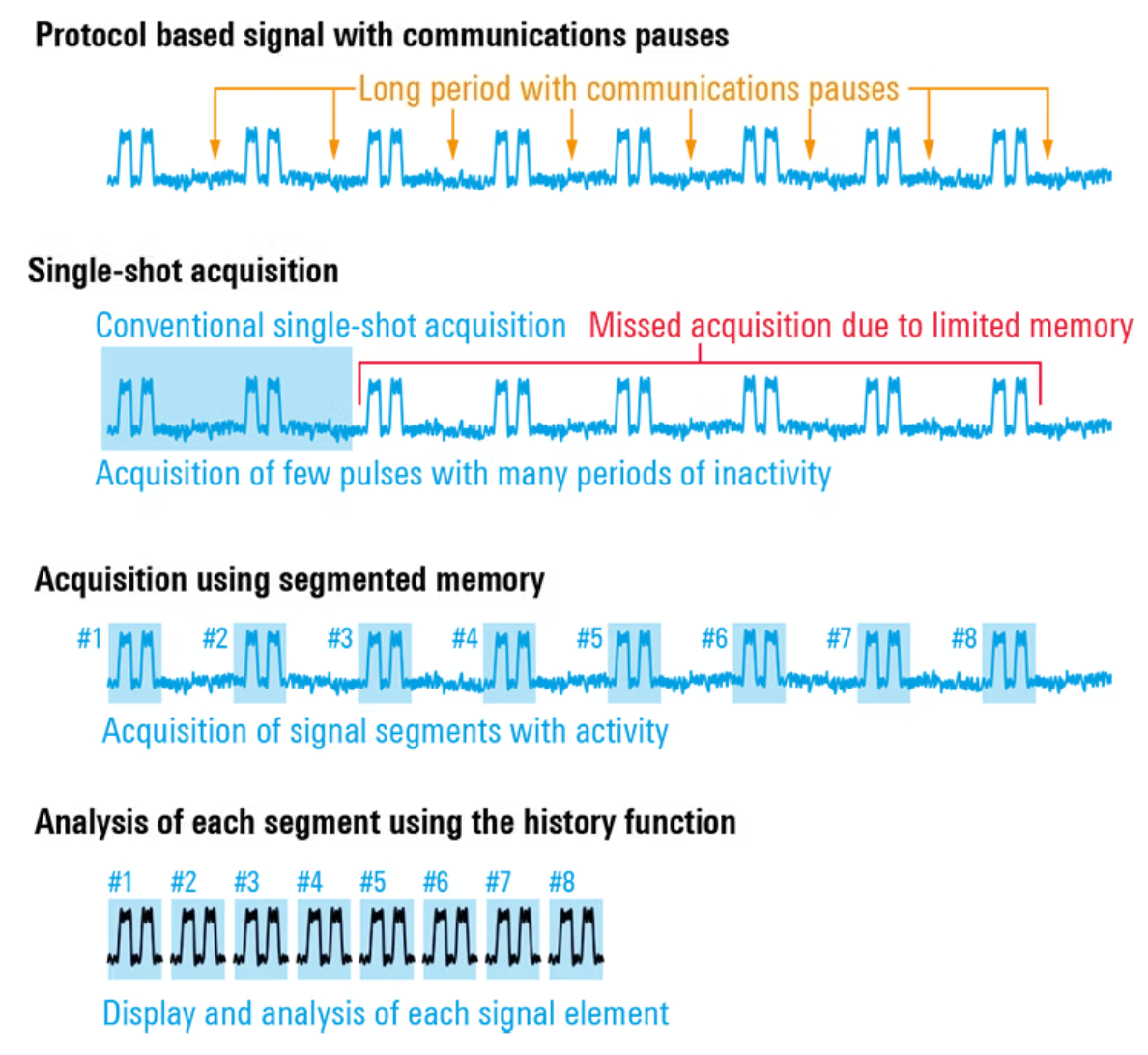 使用分段記憶體捕捉訊號,這些訊號有時沒有活動,例如雷射脈衝、串列匯流排活動、和射頻脈衝,R&S MXO 5C 系列的分段記憶體具有卓越的能力,能夠捕捉長達 10,000 個分段的訊號。它可以有效地處理需要長時間的測量或涵蓋許多事件的應用,而不會丟失重要的數據,確保了更全面的分析。