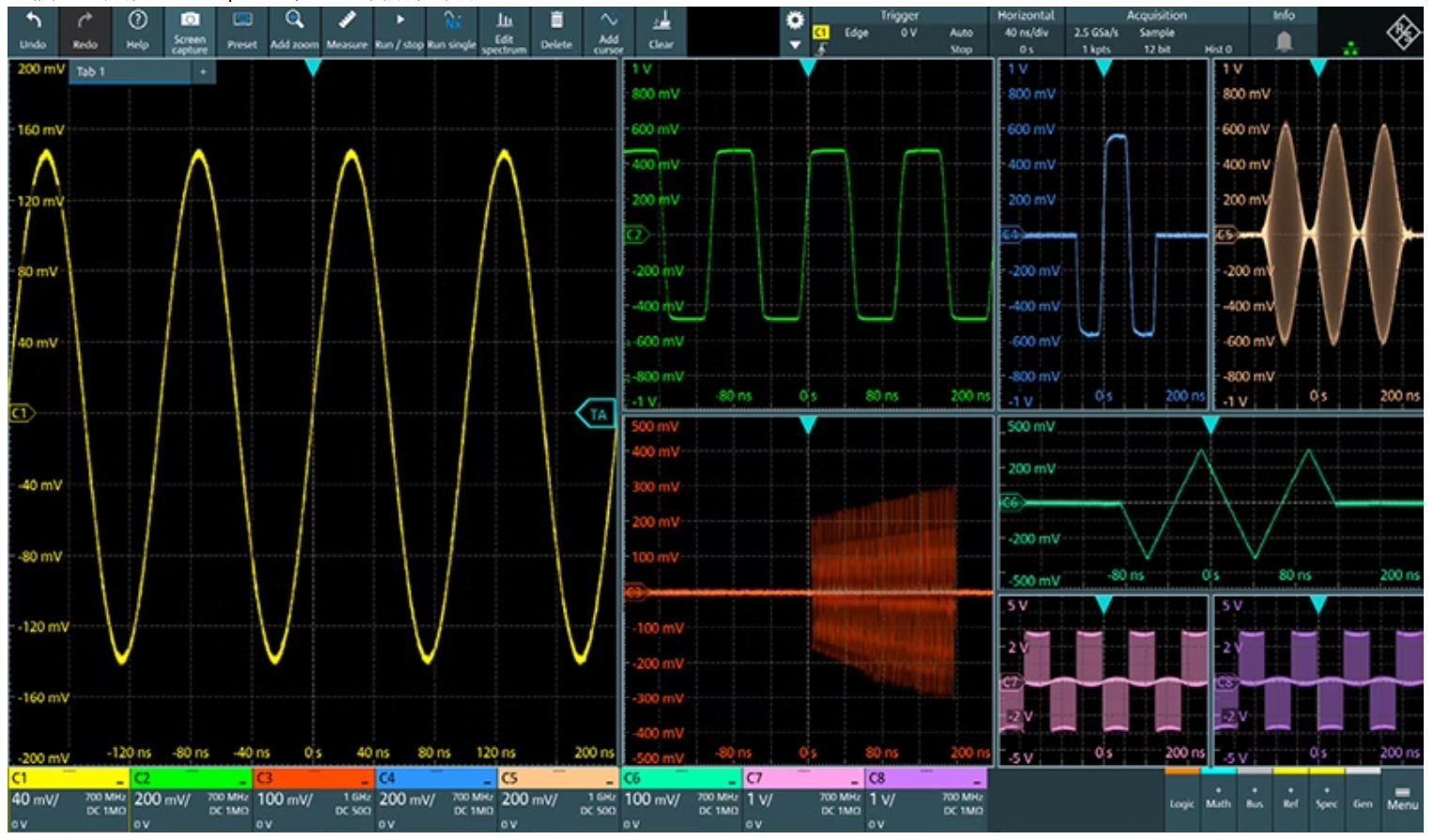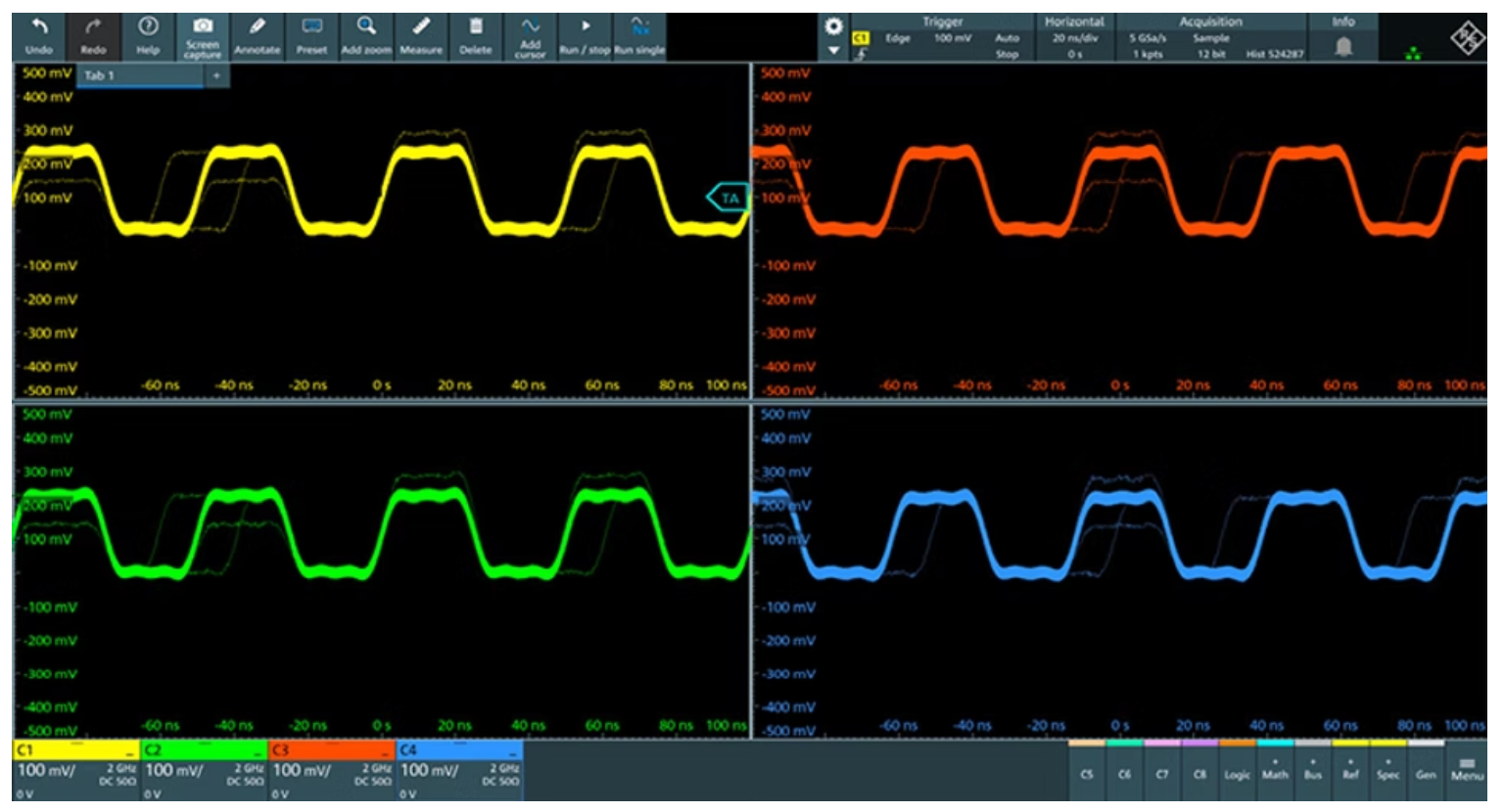 當執行具有超過 12 位垂直分辨率的多個通道時,競爭對手的示波器可能會遇到問題,導致取樣速率減慢以及示波器反應緩慢,並且可能有更多的時間片段未能捕捉重要的訊號活動;然而,所有 R&S MXO 5C 示波器的設計路徑都包括多個 MXO-EP(極限性能)ASIC,極大程度地減少這種情況的發生,這種設計確保了即使在多通道和高垂直分辨率情況下,MXO 5C 仍能提供穩定的性能,捕捉重要訊號活動而不出現困境。