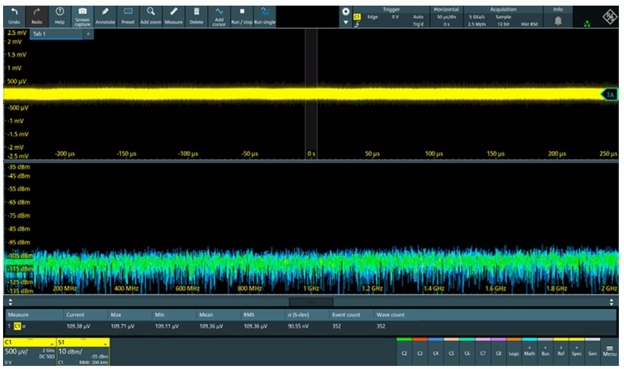2 GHz的完整頻寬下,1 mV/div 時的低雜訊表現出色,僅為130 μV。