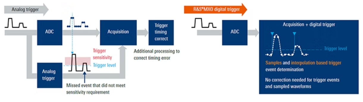 數位觸發表示量測訊號和觸發訊號共用一條路徑,而不像舊款模擬觸發架構使用不同的路徑。