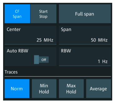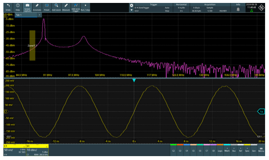 使用者只需輸入典型參數,即可配置MXO4的頻譜分析量測:中心頻率、頻率範圍和解析度頻寬(RBW)。頻譜設定和時域設定相互獨立,但時域和頻域具有時間相關性。