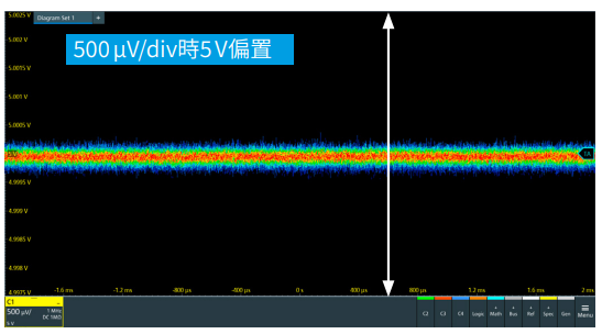MXO4系列示波器具有高達500μV/div的出色靈敏度,並且不會降低頻寬。示波器在更高的垂直靈敏度下提供±5V偏置,便於使用者輕鬆將訊號置於螢幕中心。增加偏置可實現更靈敏的垂直解析度,且ADC位元數更高,雜訊也更低。
