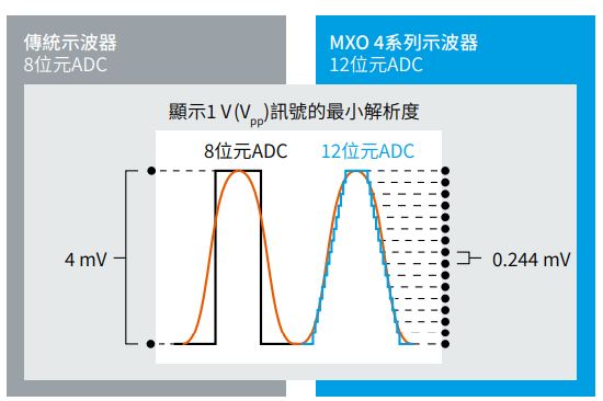 MXO4系列示波器標配12位元ADC。12位元垂直解析度可實現4096量化等級,以準確進行垂直取樣。這是8位元ADC量化等級的16倍。ADC時刻保持12位元模式,即使採用最高取樣率時也是如此。