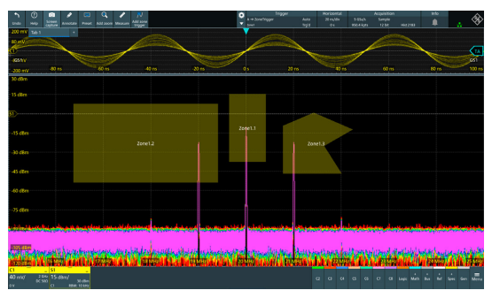 羅德史瓦茲在業內開創性地提供適用於頻譜分析的區域觸發功能。從最開始的R&S®RTO系列到MXO系列,波形擷取率進一 步得到提高,能夠檢測到雜散頻譜事件。示波器的頻譜響應速 度快,非常適合EMI除錯。MXO系列進一步增強了快速區域觸發功能,可以在時域、頻譜甚至數學運算波形上啟用觸發功能。