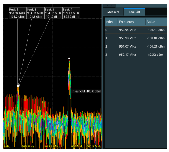 羅德史瓦茲理解使用附加工具量測頻譜的需求。因此,MXO4標配最大和最小保持以及峰值列表相互獨立等進階頻譜分析功能。峰值列表的數值也顯示在圖表中,便於輕鬆關聯並快速瞭解時頻譜圖。