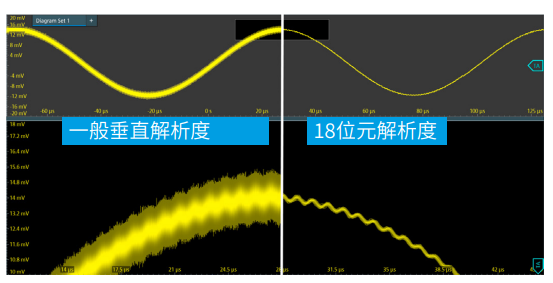 示波器可在頻寬和解析度位元數間進行權衡,基於硬體加速的HD模式可實現最高18位元垂直解析度。使用者可以獲得更加 清晰的波形,並查看在其他情況下會被雜訊遮蔽的更多訊號細 節。MXO4系列示波器不僅具備出色的垂直解析度,而且系統量測雜訊非常低,1mV/div條件下雜訊僅為22μVAC(RMS)。
