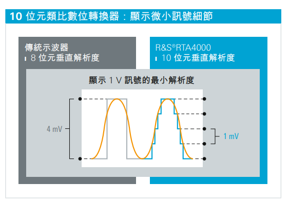 與傳統8位元類比數位轉換器相比,羅德史瓦茲設計的專用10位元類比數位轉換器產生的波形精度提高了4倍。解析度越高,波形越清晰,進而顯示更多在其他情況下可能 忽略的訊號細節。比如在測量開關電源的特性時, 在單次擷取中,必須同時測量開關設備開啟和切斷時的電壓。為精確 測量小電壓部分,解析度必須高於8位元。透過高解析度取樣,R&S®RTA4000甚至提供高達16位元的垂直解析度,這在同類儀器中是前所未有的