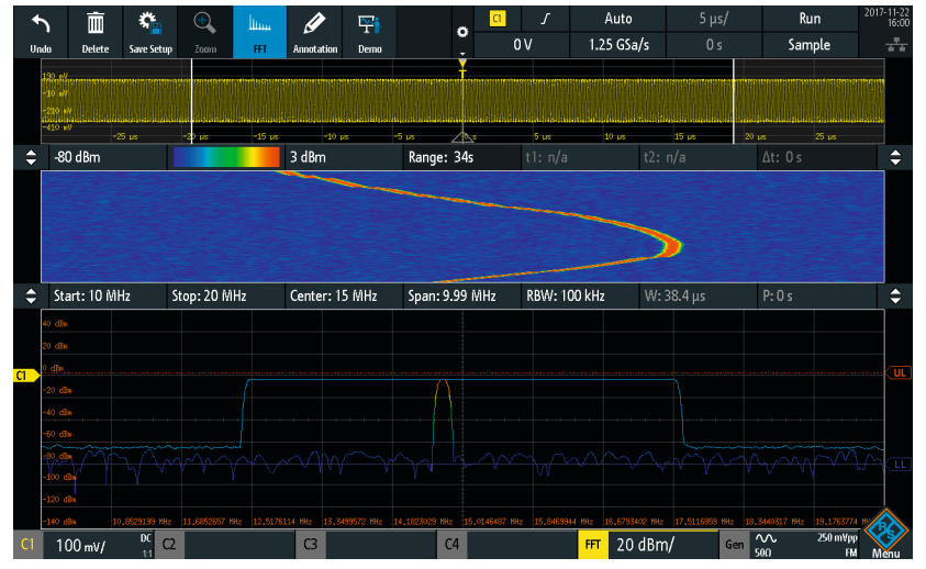 高級電子設備的操作取決於協定介面、數位、類比和頻率元件之間的無縫交互。因此必須同步分析所有元件。時間、頻率和協定資訊彼此關聯,並且可以快速識別時間參考。測量窗口可用於選擇特定的記錄區域,從而簡化頻變訊號的擷取分析。