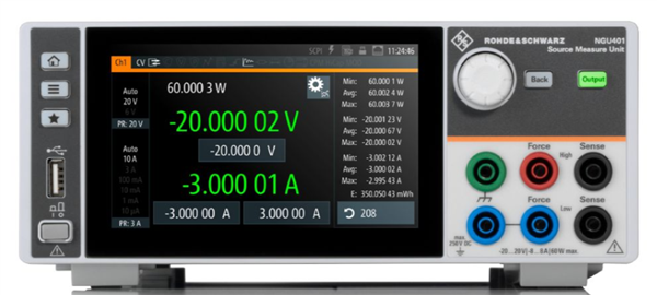 量測電壓、電流和功率時,R&S®NGU 電源量測單元的解析度可達 6 ½ 位元,非常適用於量測在待機模式下具有低功耗、在滿載運行時具有大電流的設備的特性。它支援兩種電壓量測範圍和六種電流量測範圍(R&S®NGU411 支援五種量測範圍),量測精度和解析度可達 1 µV/100 pA。輸出端採用電位隔離和浮接方式