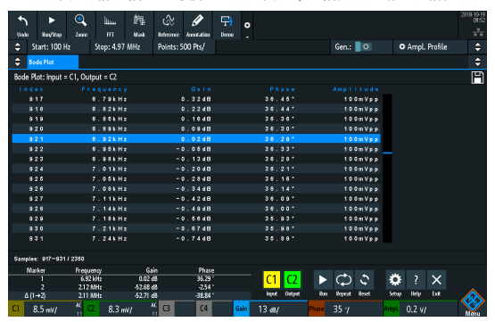 此外,您可以在表格中查看結果。 量測結果表中詳細描述了每個量測點的資訊,包括頻率、增益和相位偏移。 如為方便起見而使用游標,則也可以將結果表的相關行高亮顯示。 使用者可以將螢幕截圖和/或結果表快速儲存到 USB 設備,以方便報告。