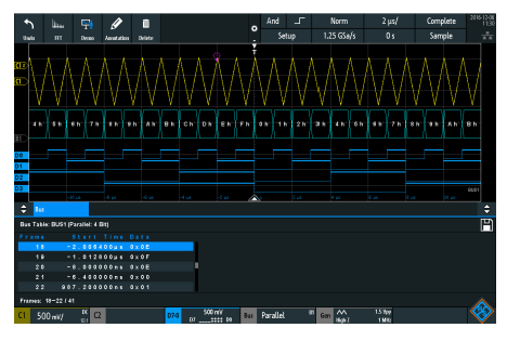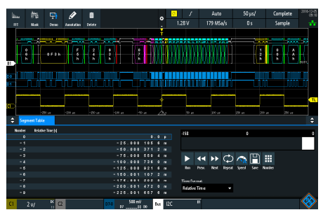 R&S®RTB-K15 歷史功能選項使儲存深度從10 Msample 提昇至160 Msample。 使用者可以使用示波器工具(例如協定解碼和邏輯通道)滾動瀏覽並分析過去採集的數據。 您幾乎可以無中斷地記錄串列協定和脈衝序列。