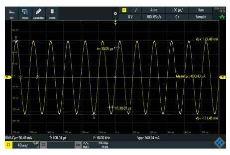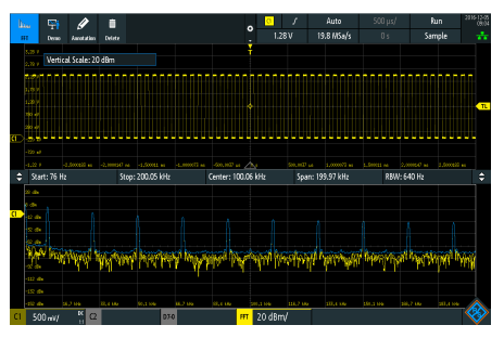 有些故障難以察覺,這通常是因為時間和頻率訊號之間的相互作用。 只要按下按鈕,輸入中心頻率和掃頻寬度,即可啟動 R&S®RTB2的 FFT 功能。 R&S®RTB2示波器具有強大的 FFT 功能,可分析最長達128 kpoints 的訊號。 其他工具包括游標量測和頻域自動設定。