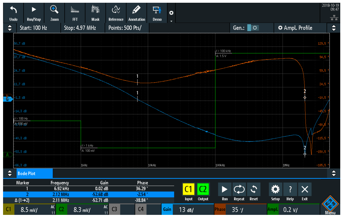 您可以選擇十進制頻率點數,以設定和調節波特圖的解析度。示波器最高支援 500 points/decade。 使用者可以將游標直接拖至繪製曲線上的所需位置。 圖例所示為游標的相應座標。 如要確定交叉頻率,可以將一個游標設定為 0 dB,將另一個游標設定為 –180° 相位偏移。現在,您可以輕鬆確定相位和增益廣度。