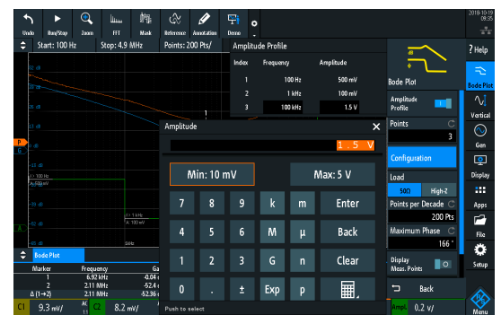 藉由 R&S®RTB-K36 頻率響應分析(波特圖)選配,使用者可以分析產生器的振幅輸出位準。 在執行控制迴路響應或電源衰減率分析時,該選配有助於抑制 DUT 的雜訊特點,還有助於提高信噪比(SNR)。 最多可定義16階躍。