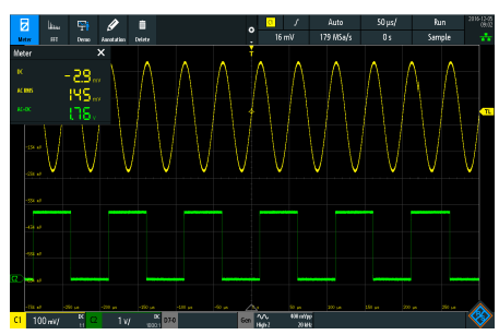 R&S®RTB2在每個通道上設有三位數數位電錶 (DVM) 和六位計頻器,可實現同步量測。 量測功能包括 DC、AC + DC (RMS) 和 AC (RMS)。*1