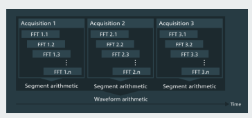 R&S®RTO6示波器的重疊FFT功能將所捕獲的時域信號分割成重疊段,並分別計算每個分段的頻譜。然後,示波器會根據發生頻率對這些頻譜標注不同的顏色,再將其匯集並組合成一個完整的頻譜。該完整頻譜有助於全面了解不同頻率發射的類型和重現頻率。即便是偶發信號也依然可見。