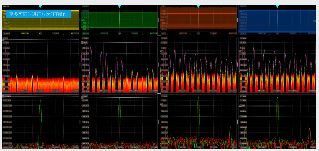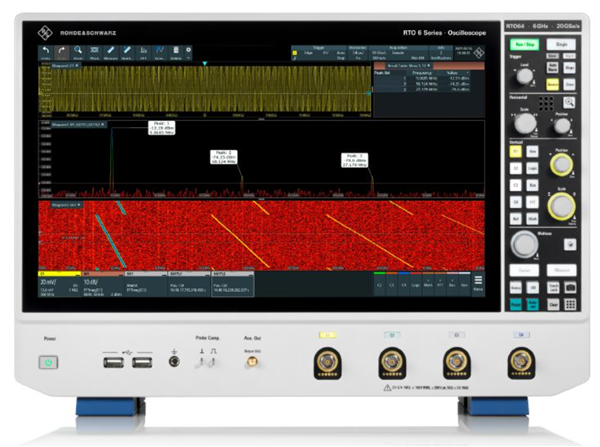 R&S®RTO6示波器支持強大的多通道頻譜分析功能,最多可同時分析八路信號。示波器具有出色的動態範圍和輸入靈敏度(全測量帶寬下可達1mV/div),能夠檢測出微弱的輻射。強大的FFT功能易於操作,並具備高捕獲率以及根據發生頻率采用不同顏色編碼的頻譜顯示等功能,非常適合在頻域中進行所需分析。