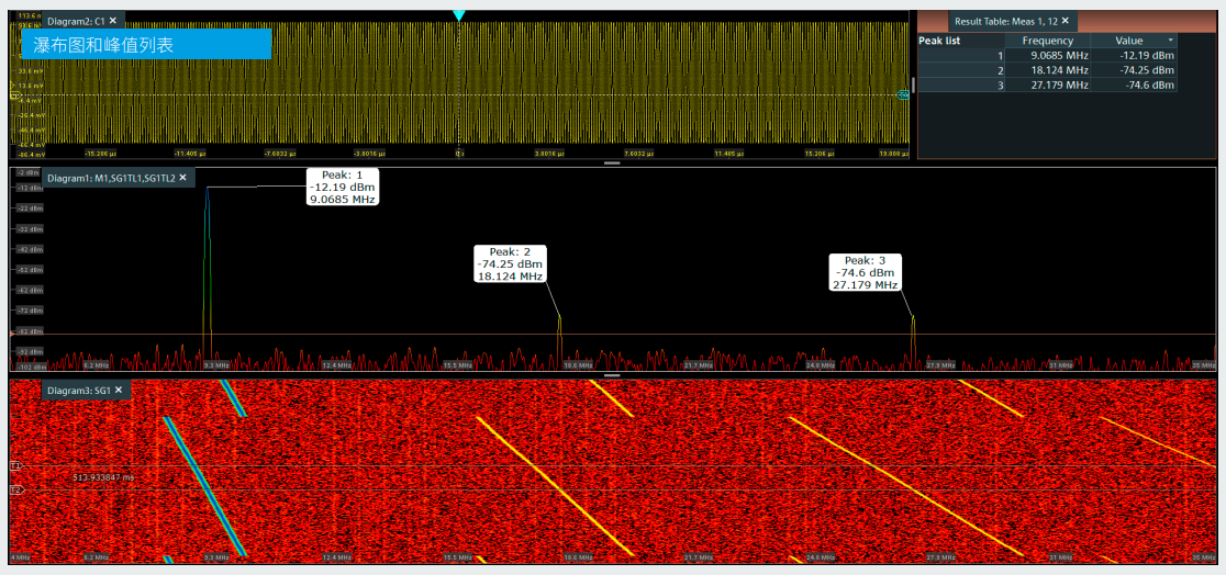 峰值列表測量自動檢測FFT頻譜的峰值,並在頻譜圖和結果表中顯示峰值的幅度和頻率。