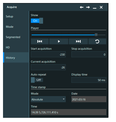 R&S®RTO6示波器的歷史功能始終處於開啟狀態,確保可訪問保存在內存中的歷史波形。觸發時間戳可直接將波形與時間相關聯。用戶可以使用縮放、測量、數學運算和頻譜分析功能查看並分析所有捕獲的信號。