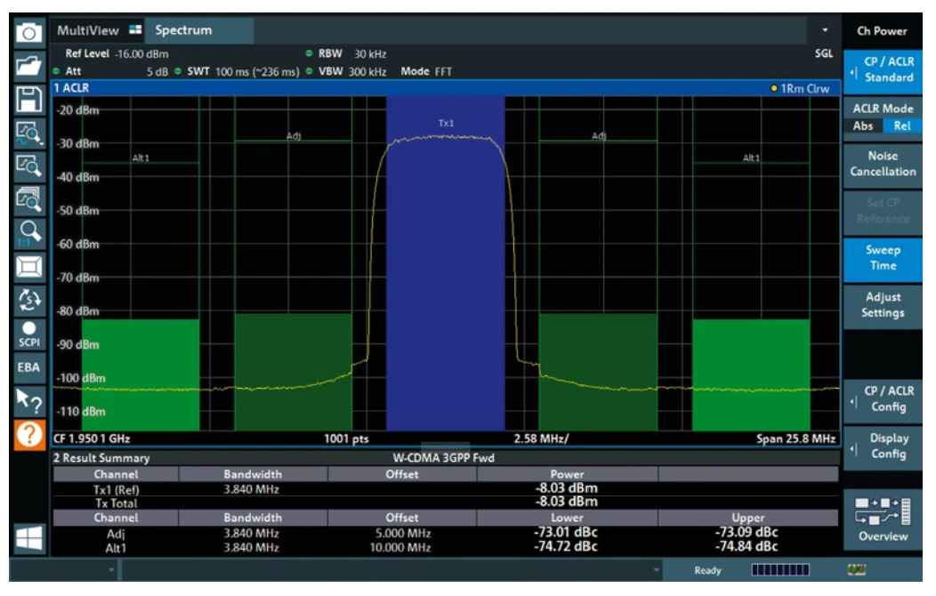 元件、模組和設備的自動化生產,需要光譜 (spectral) 量測和訊號解調,R&S FSVA3000 訊號和頻譜分析儀可在最短時間內執行複雜的量測週期,它可以在最短時間內執行頻譜量測、訊號解調和不同測量模式之間的切換,其合成器 (synthesizer) 技術可實現快速頻率切換,以 FFT 為基礎的 ACLR 和 SEM 測試比掃頻測試更快,同時提供相同的動態範圍。